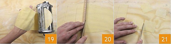 Passé le temps de repos de la pâte, étalez-la avec une machine à pâtes : pour commencer, coupez un morceau de pâte, afin de le faire passer plus facilement à travers la machine. Aplatissez avec les mains le morceau que vous avez coupé et positionnez le bouton latéral de la machine sur l'épaisseur la plus large. Passez la pâte plusieurs fois et à mesure qu'elle devient plus fine, réduisez l'épaisseur de la machine, jusqu'à obtenir une feuille fine 19. Consultez l'École de cuisine : rouler la feuille avec la machine, que vous trouvez ici, pour découvrir toutes les étapes de ce processus. Une fois la pâte étalée, découpez des petits carrés de 5X5 cm (20-21).