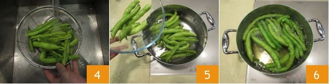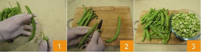 Pour la poêlée de cosses de fèves, commencez par mettre une casserole d'eau sur le feu où vous ferez ensuite blanchir les cosses, puis passez à la préparation en retirant le filament central avec l'aide d'un petit couteau 1 ; enlevez les deux extrémités 2 et faites de même pour toutes en les séparant des fèves 3 que vous pourriez utiliser pour d'autres recettes, comme par exemple la salade de fèves. Si vous préférez, vous pouvez porter des gants pour nettoyer les fèves, cela évitera que des résidus de terre ne finissent sous vos ongles.