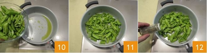 quand l'huile est bien chaude, retirez l'ail et ajoutez les cosses coupées 10, en les laissant revenir quelques minutes à feu vif 11 et assaisonnez de sel et de poivre 12.