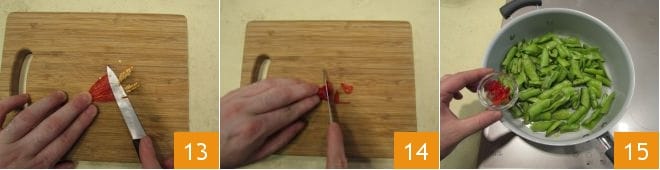 Entre-temps, incisez un piment, retirez-en les graines 13, puis coupez-le en lamelles 14 et ajoutez-les aux cosses de fèves 15.