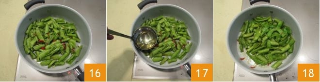 Laissez cuire encore à feu vif quelques instants 16 puis déglacez avec une louche de liquide de cuisson des fèves que vous avez mis de côté (si vous préférez, vous pouvez ajouter du bouillon de légumes en remplacement) 17 et laissez cuire pendant encore 10 minutes jusqu'à ce que la poêlée de cosses de fèves soit bien sèche 18.