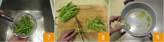 Après les 5 minutes, égouttez les cosses et rincez-les sous l'eau froide pour stopper la cuisson 7 ; égouttez-les, placez-les sur une planche à découper et coupez-les en losanges en divisant les cosses en 3-4 morceaux selon la longueur 8. Si vous préférez une odeur d'ail moins intense, coupez-le en deux et retirez-en le germe, puis mettez-le dans une casserole avec l'huile pour le faire revenir quelques instants 9 ;