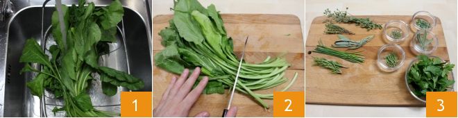 Pour préparer le poulet au vert, commencez par nettoyer les bettes : lavez-les sous l'eau courante 1 et placez-les sur une planche à découper, puis enlevez les tiges 2. Ensuite, équeutez toutes les herbes aromatiques et transférez-les dans des petits bols 3.