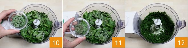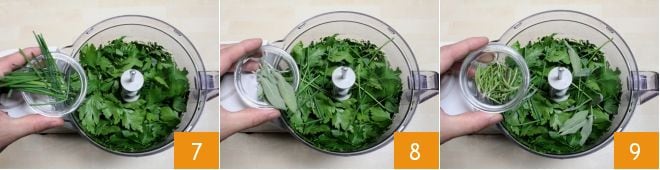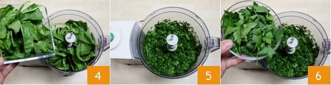 Mettez les bettes nettoyées dans un mixeur 4 et mixez-les jusqu'à ce qu'elles soient finement hachées 5. Ajoutez maintenant les différentes herbes aromatiques, en commençant par le persil 6.