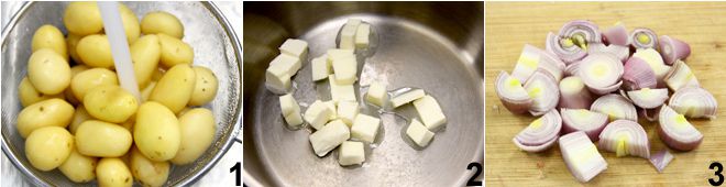 Pour préparer les pommes de terre nouvelles au vin rouge, commencez par bien laver les pommes de terre nouvelles 1, et mettez-les à blanchir quelques minutes dans une casserole avec de l'eau bouillante salée, jusqu'à ce que leur intérieur soit tendre, puis égouttez-les bien. Coupez en deux les plus grosses. Dans une grande poêle, faites fondre le beurre à feu très doux 2 ; entre-temps, coupez les échalotes en gros morceaux 3,