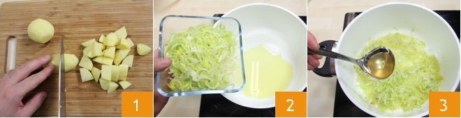 Pour préparer la Potage Parmentier, épluchez, lavez et coupez grossièrement les pommes de terre 1 et en rondelles les poireaux. Faites revenir les poireaux dans une poêle antiadhésive avec 3 cuillères à soupe d'huile pendant quelques minutes 2, puis ajoutez une louche de bouillon et laissez-les cuire à feu doux pendant 5-6 minutes 3.