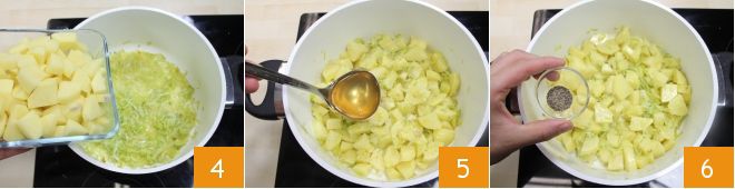 Ajoutez les pommes de terre 4 et couvrez les légumes juste à hauteur avec le reste du bouillon 5. Assaisonnez de sel et de poivre et poursuivez la cuisson à feu modéré, le temps nécessaire pour que les pommes de terre deviennent tendres (cela prendra environ 15/20 minutes, selon le type de pomme de terre).
