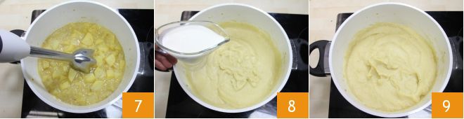 Une fois la cuisson terminée, mixez le tout à l'aide d'un mixeur plongeant 7, ajoutez la crème 8 et mélangez soigneusement pour bien incorporer tous les ingrédients. Faites cuire le velouté encore 5 minutes, puis éteignez le feu et servez la Potage Parmentier tant qu'elle est encore chaude, éventuellement accompagnée de tranches de pain grillé et d'une pincée de parmesan râpé.
