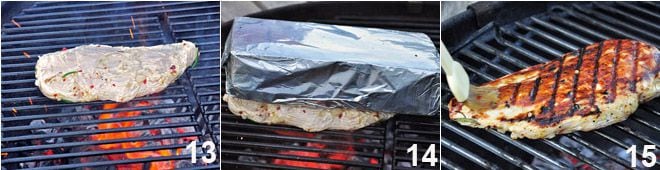 Une fois le temps écoulé, épongez la marinade de la poitrine de poulet et placez-la sur la grille 13, puis positionnez le poids dessus 14. Réduisez la flamme sous le poulet et faites-le cuire pendant environ 5 minutes. Retirez la brique, tournez le poulet de 90°, remettez la brique et cuisez pendant encore 5 minutes. Retirez de nouveau la brique, badigeonnez avec la marinade restante 15, retournez le poulet et remettez la brique. Cuisez de la même manière que le côté précédent. Une fois la cuisson terminée, dressez le plat en le décorant d'une branche de romarin.