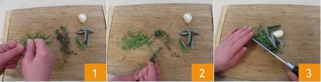 Pour préparer le poulet avec pommes de terre, champignons et petits oignons, commencez par mettre sur le feu une casserole d'eau salée qui vous servira pour le bouillon de légumes. Effeuillez le romarin 1 et le thym 2, ajoutez la sauge et l'ail et hachez finement tous les arômes 3 et mettez-les dans un bol;