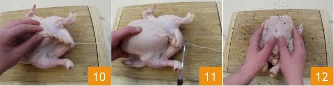 Refermez le poulet à l'aide d'une aiguille de cuisine et de ficelle 11. Une fois cette opération terminée, coupez l'excès de fil 12, puis saupoudrez l'extérieur du poulet avec les arômes que vous avez mis de côté 13.