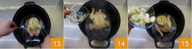 Placez sur le feu une casserole à fond épais avec un filet d'huile. Déposez le poulet 13, en le tournant de chaque côté avec des pinces de cuisine pour une dorure uniforme, puis déglacez avec le vin blanc 14. Ajoutez les petits oignons épluchés 16,