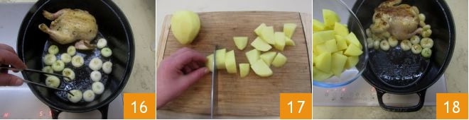 en les disposant côte à côte et en les tournant de chaque côté pour une cuisson uniforme 16 jusqu'à ce qu'ils soient bien dorés : cela prendra environ 6-7 minutes. Pendant ce temps, coupez les pommes de terre en gros cubes 17. Déplacez légèrement les oignons et ajoutez les pommes de terre coupées dans la casserole, en les faisant dorer pendant quelques minutes 18.