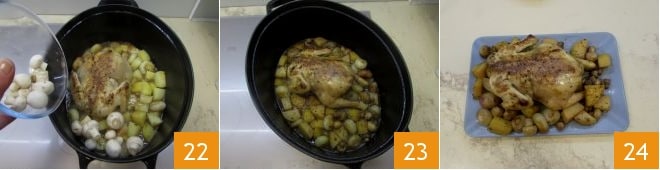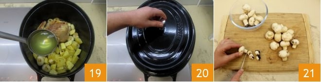 Une fois le temps écoulé, ajoutez les champignons nettoyés entiers 22 et laissez cuire pendant 10 minutes en couvrant toujours avec le couvercle. Ensuite, retirez-le et cuisez pendant encore 5 minutes : éteignez le feu 23 et votre poulet avec pommes de terre, champignons et petits oignons est prêt à être servi 24.