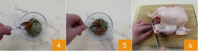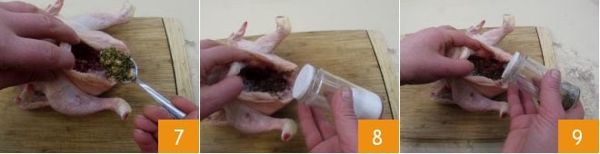 Prenez les arômes hachés et remplissez une cuillère à la fois l'intérieur du poulet 7 (gardez-en une petite partie qui vous servira plus tard), en assaisonnant de sel et de poivre (8-9).