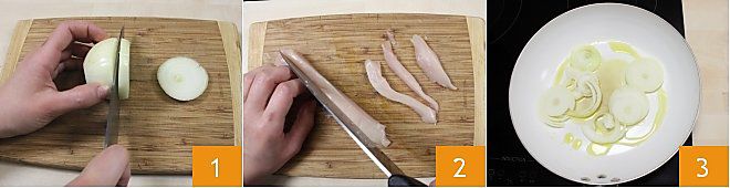 Pour préparer les quesadillas, commencez par couper l'oignon en tranches pas trop fines 1. Ensuite, occupez-vous des blancs de poulet : placez-les sur une planche à découper et coupez-les en lanières 2. Après avoir fait chauffer un filet d'huile dans une poêle antiadhésive, ajoutez-y l'oignon en tranches et faites cuire à feu doux jusqu'à ce qu'il soit doré 3.