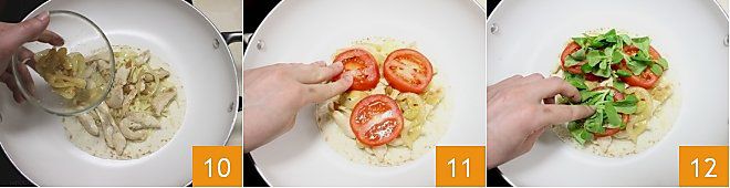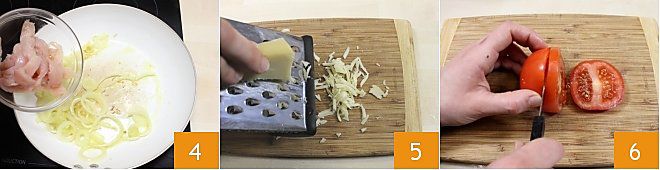 Ajoutez ensuite les lanières de poulet 4 et faites cuire pendant environ 15 minutes, salez à votre convenance. Pendant ce temps, râpez la fontine (ou l'Edamer) 5, lavez soigneusement la tomate et coupez-la en tranches 6.