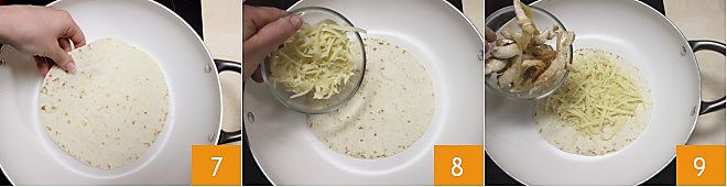 Ensuite, prenez une poêle et faites chauffer la tortilla des deux côtés 7, si vous le souhaitez, vous pouvez préparer vous-même les tortillas de farine ou les tortillas de maïs. Ensuite, formez une première couche de fromage râpé 8 et déposez-y le poulet en lanières 9.