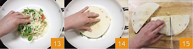 Terminez en formant une autre couche de fromage râpé 13 et fermez avec une autre tortilla, en appuyant bien pour faire adhérer le fromage à la tortilla 14. Une fois le feu éteint, transférez les quesadillas sur une planche à découper et divisez-les en 4 parties 15. Vos quesadillas sont prêtes à être servies et dégustées encore chaudes!