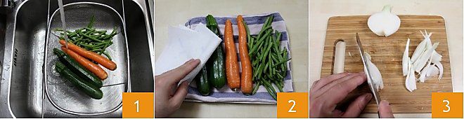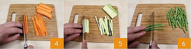 Épluchez la carotte avec un épluche-légumes, divisez-la en deux, coupez-la dans le sens de la longueur puis formez des bâtonnets 4. Prenez la courgette et, sans l'éplucher, coupez-la en bâtonnets comme la carotte 5. Après avoir coupé en deux les haricots verts 6, mettez de côté les légumes dans des petits bols.