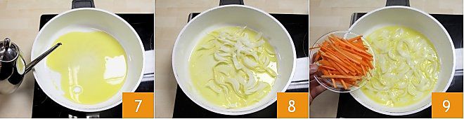 Versez l'huile d'olive extra vierge dans une poêle antiadhésive 7 et lorsque l'huile est bien chaude, ajoutez le jeune oignon coupé en quartiers 8. Faites cuire pendant 5-6 minutes à feu moyen, en ajoutant de l'eau pour le faire fondre, puis ajoutez les carottes et laissez-les cuire encore deux minutes seulement avec le jeune oignon 9.