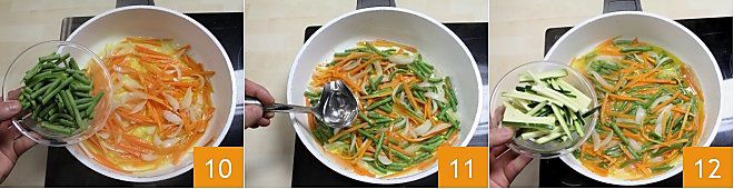 Ajoutez les haricots verts 10, salez et poivrez à votre goût. Ajoutez encore de l'eau pour faciliter la cuisson 11 et faites cuire à feu modéré pendant 6 minutes, puis ajoutez les courgettes 12.