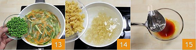 Enfin, ajoutez les petits pois 13 et salez et poivrez de nouveau. Laissez cuire les légumes pendant environ 15 minutes à feu doux, jusqu'à ce qu'ils s'attendrissent. À ce stade, faites bouillir l'eau dans une casserole et une fois l'ébullition atteinte, versez les radiatori 14, faites cuire pendant environ 9 minutes. Pendant ce temps, prenez un petit bol, versez-y le sachet de safran et ajoutez un peu d'eau de cuisson 15.