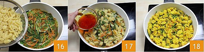 Aussitôt que les radiatori sont cuits, égouttez-les et mettez-les dans la poêle avec les légumes 16, mélangez le tout, en mélangeant bien les pâtes avec les légumes. Immédiatement après, ajoutez le safran dissous dans l'eau de cuisson que vous aviez préparée 17 et mélangez. Maintenant, vos radiatori aux légumes et safran sont prêts 18 à être servis et dégustés !