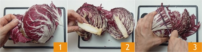 Pour réaliser le radicchio à la poêle, commencez par enlever les feuilles extérieures 1, puis divisez le chou en deux et retirez le cœur central 2. Enfin, coupez les feuilles en lanières 3.