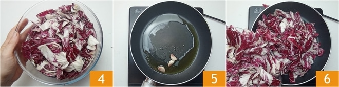 Lavez le radicchio sous l'eau courante 4. Si vous souhaitez atténuer son amertume, vous pouvez le laisser tremper pendant 30 minutes avec une pincée de sel, sinon passez cette étape. Dans une poêle antiadhésive, faites rissoler les gousses d'ail en chemise avec l'huile 5, puis ajoutez le radicchio bien égoutté 6.