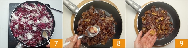 Salez et poivrez 7, puis mélangez et cuisez à feu moyen-doux pendant environ 15 minutes. Quand le radicchio est ramolli et a changé de couleur, éteignez le feu et retirez les gousses d'ail 8. Garnissez le radicchio à la poêle avec les cerneaux de noix juste avant de servir 9 !
