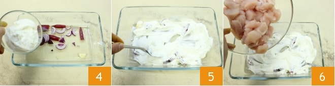 puis dans un plat, placez 1 gousse d'ail, la moitié de l'oignon rouge haché, le piment et le yaourt grec 4. Mélangez à la fourchette pour bien amalgamer les arômes 5. Ajoutez les morceaux de poulet dans la sauce 6, salez,