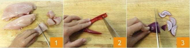 Pour réaliser le ragoût de poulet au yaourt, commencez par couper le blanc de poulet en morceaux d'environ 2 cm d'épaisseur 1. Ensuite, préparez la marinade : coupez le piment en lanières et retirez les graines 2, émincez finement l'oignon 3