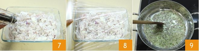 poivrez 7 et couvrez le plat avec du film alimentaire 8. Laissez reposer la viande au réfrigérateur pendant au moins deux heures. Une fois le temps de repos écoulé, dans une grande poêle, faites revenir avec de l'huile la moitié de l'oignon haché avec les herbes aromatiques (romarin, sauge) également hachées 9;