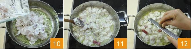 ajoutez le poulet avec sa sauce de marinade (10-11), faites dorer pendant 10 minutes puis parfumez la préparation avec de la muscade râpée 12, assaisonnez avec du poivre et du sel à votre convenance,