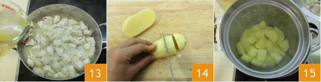 couvrez le poulet avec le bouillon 13 et laissez cuire à feu doux pendant 1 heure en couvrant la cocotte avec un couvercle. Préparez entre-temps les pommes de terre au persil qui serviront d'accompagnement : pelez et lavez les pommes de terre, coupez-les en morceaux 14, faites-les blanchir dans l'eau bouillante salée pendant 5 minutes. Égouttez-les 15