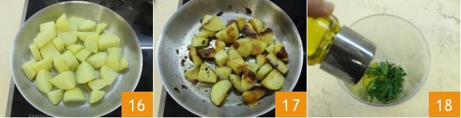 et faites-les sauter à la poêle 16 pendant encore 5 minutes jusqu'à ce qu'elles deviennent croquantes et dorées 17. Préparez maintenant la sauce au persil qui servira à assaisonner les pommes de terre : Dans un petit mixeur, mettez le persil avec l'huile 18