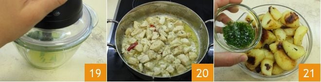 Faites fonctionner le mixeur pendant quelques instants 19, le temps nécessaire pour émulsionner le mélange, ajustez la sauce de sel et de poivre. Si vous ne disposez pas de mixeur, vous pouvez hacher le persil au couteau puis émulsionner avec l'huile en vous aidant d'un fouet. Entre-temps, le ragoût de poulet au yaourt sera prêt 20, servez-le bien chaud avec les pommes de terre assaisonnées avec la sauce au persil 21.
