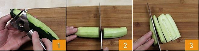 Pour réaliser la raita, commencez par peler le concombre avec un économe 1 ou un couteau, puis coupez le concombre en deux 2, coupez les deux moitiés dans le sens de la longueur en fines tranches 3, et de celles-ci, découpez des bâtonnets