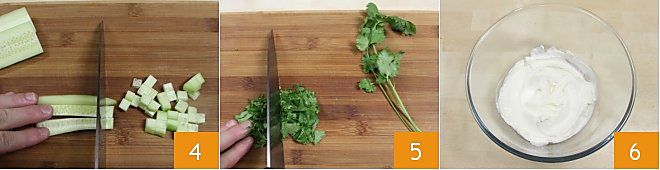 et enfin réduisez les bâtonnets en petits dés 4. Pour plus de détails, consultez notre École de cuisine Comment couper les légumes. Lavez la coriandre et tamponnez-la avec un torchon pour la sécher, puis hachez-la finement avec un couteau 5 et mettez-la de côté. Maintenant, prenez un bol et versez-y le yaourt 6,