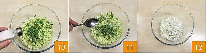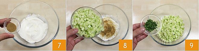 ajoutez le cumin en poudre 7, le concombre coupé en dés 8, la coriandre hachée 9,