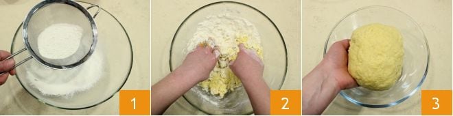 Pour préparer le raviolone au jaune d'œuf fondant avec ricotta et épinards, commencez par la pâte fraîche (vous pouvez consulter la procédure complète dans la fiche de l'École de Cuisine : pâte fraîche à l'œuf, en suivant les doses de cette recette). Dans un bol, tamisez la farine 1, les œufs et commencez à pétrir dans le bol 2. Une fois que les œufs seront absorbés, prenez la pâte 3