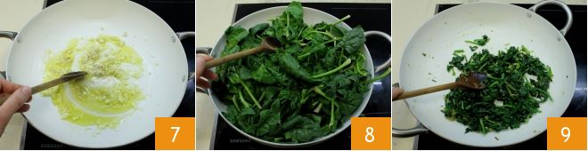 faites-le revenir dans une poêle avec un filet d'huile et 15 g de beurre 7. Lorsqu'il sera fané, ajoutez les épinards préalablement lavés 8, ajoutez très peu d'eau et faites-les cuire avec le couvercle pendant quelques minutes. À la fin de la cuisson, ils seront fanés 9, laissez-les sécher, puis éteignez le feu.