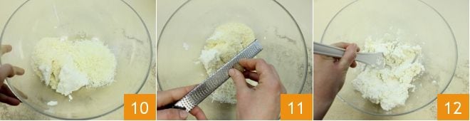 Dans un bol, versez la ricotta, les fromages râpés 10 et une râpée de noix de muscade 11. Ensuite, mélangez le tout avec une spatule 12.
