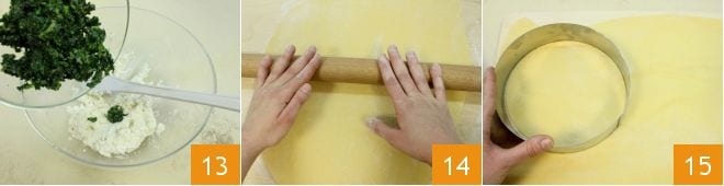 Ajoutez également les épinards cuits et hachés à la garniture de fromages 13, ajustez le sel et le poivre et mélangez le tout soigneusement (pour réaliser la garniture, vous pouvez également utiliser un mixeur, en mixant ensemble tous les ingrédients). Maintenant, reprenez la pâte fraîche, étalez-la en une feuille mince de quelques millimètres en vous aidant d'un long rouleau : la pâte sera assez élastique, donc vous pouvez tenir une extrémité avec la main et faire glisser le rouleau sur la pâte avec l'autre. Étirez-la bien dans tous les sens jusqu'à obtenir une feuille fine 14. Découpez 8 disques avec un emporte-pièce (ou alternativement en suivant le contour d'un petit bol) de 18 cm de diamètre chacun 15.