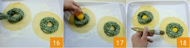 Une fois les disques de pâte obtenus, transférez le mélange d'épinards et de ricotta dans une poche à douille et réalisez deux spirales de mélange pour chacun des 4 disques 16. Au centre de chaque spirale, versez un jaune d'œuf 17 en gardant le blanc d'œuf de côté qui servira à badigeonner les bords des 4 disques garnis 18.