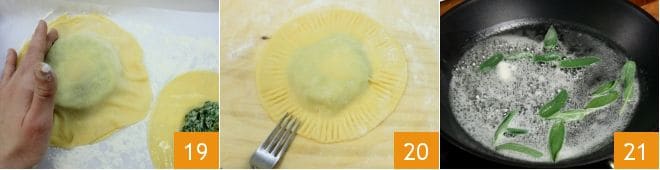 Sur chaque disque garni, posez-en un autre et pressez délicatement les bords pour les sceller 19. Ensuite, décorez avec les dents d'une fourchette délicatement tout autour des bords 20. Posez les raviolones sur un torchon fariné et en attendant, faites bouillir beaucoup d'eau dans une grande casserole aux bords hauts. Pendant ce temps, faites fondre le beurre dans une poêle et ajoutez les feuilles de sauge 21.