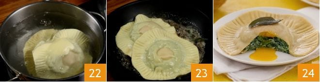 Lorsque l'eau commencera à frémir, plongez délicatement les raviolones, deux à la fois 22; laissez-les cuire seulement pendant quelques minutes, puis égouttez-les et faites-les sauter dans la poêle avec le beurre et la sauge 23. Une fois assaisonnés, transférez un raviolone sur chaque assiette de service et décorez-le avec une feuille de sauge 24; vous pouvez également assaisonner avec une pincée de Grana Padano avant de le servir bien chaud à vos convives!