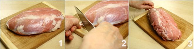 Prenez votre noix de veau et posez-la sur une planche à découper 1; retirez avec un couteau les éventuels cartilages 2, puis attachez-la avec une ficelle de cuisine 3.