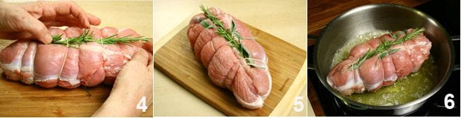 Disposez le romarin et quelques feuilles de sauge sur votre rôti (4-5). Prenez une casserole et, après avoir chauffé l'huile et le beurre, déposez-y la viande 6.